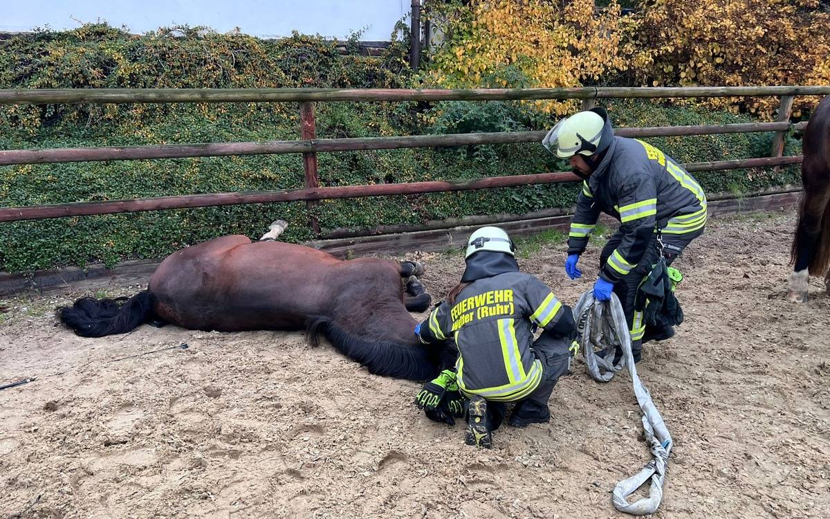 Gegen 17.45 Uhr ging der Alarm bei der Feuerwehr ein. Als die Einsatzkräfte vor Ort in Esborn waren, war die Person bereits befreit. Nach der Erstversorgung wurde sie in ein Krankenhaus gebracht. Parallel kümmerte sich eine Feuerwehrkameradin um das Pferd. Es konnte zunächst nicht selbstständig aufstehen. Mit einer Rundschlinge halfen die Einsatzkräfte dem Tier in eine andere Position, sodass es anschließend wohlbehalten aufstand.