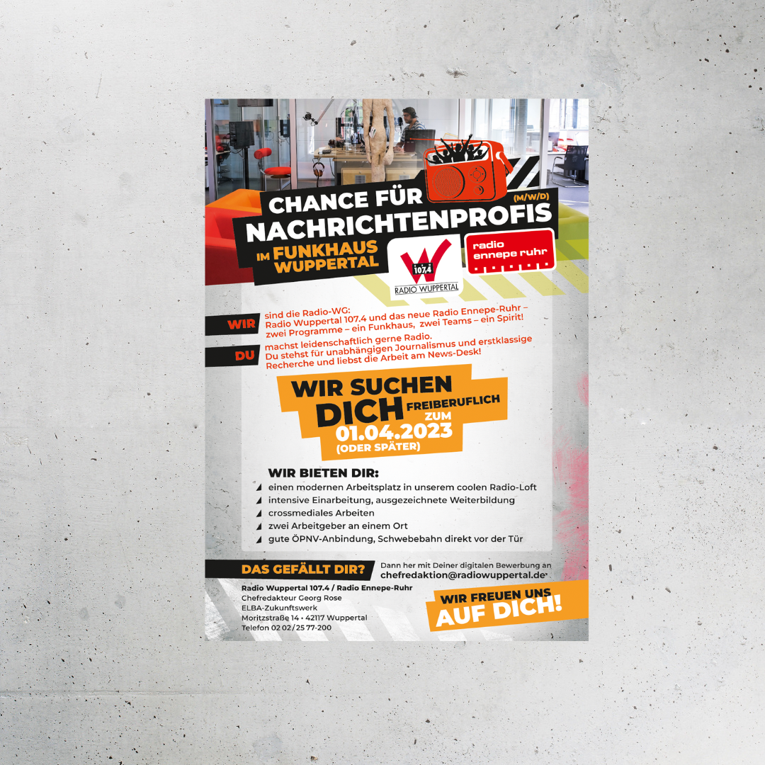 Wir suchen NachrichtenprofisVeröffentlicht: Freitag, 31.03.2023 00:00Wir suchen Nachrichtenprofis für unsere Radio WG!© © Wir suchen Nachrichtenprofis (rw-stellenanzeige-funkhaus-wuppertal-210x297mm-4c-01.pdf)Wir suchen Nachrichtenprofis!