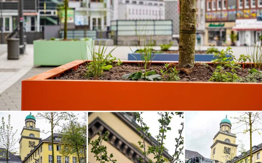 In Witten sind jetzt 13 mobile Bäume auf den Rathausplatz umgezogen. Ursprünglich sollte das bereits Ende Februar passieren, musste aber wegen Krankeitsfällen bei der Fachfirma verschoben werden. Drei der insgesamt 16 Bäume stehen schon länger vor der Stadtgalerie. Die restlichen 13 waren auf dem Kornmarkt und vor dem Schiller-Gymnasium geparkt und konnten jetzt endlich umziehen. Fünf der Pflanzkästen sind mit Sitzgelegenheiten versehen. Außerdem sind alle Kästen mit Wasserspeichern ausgerüstet, um eine optimale Pflege zu gewährleisten.