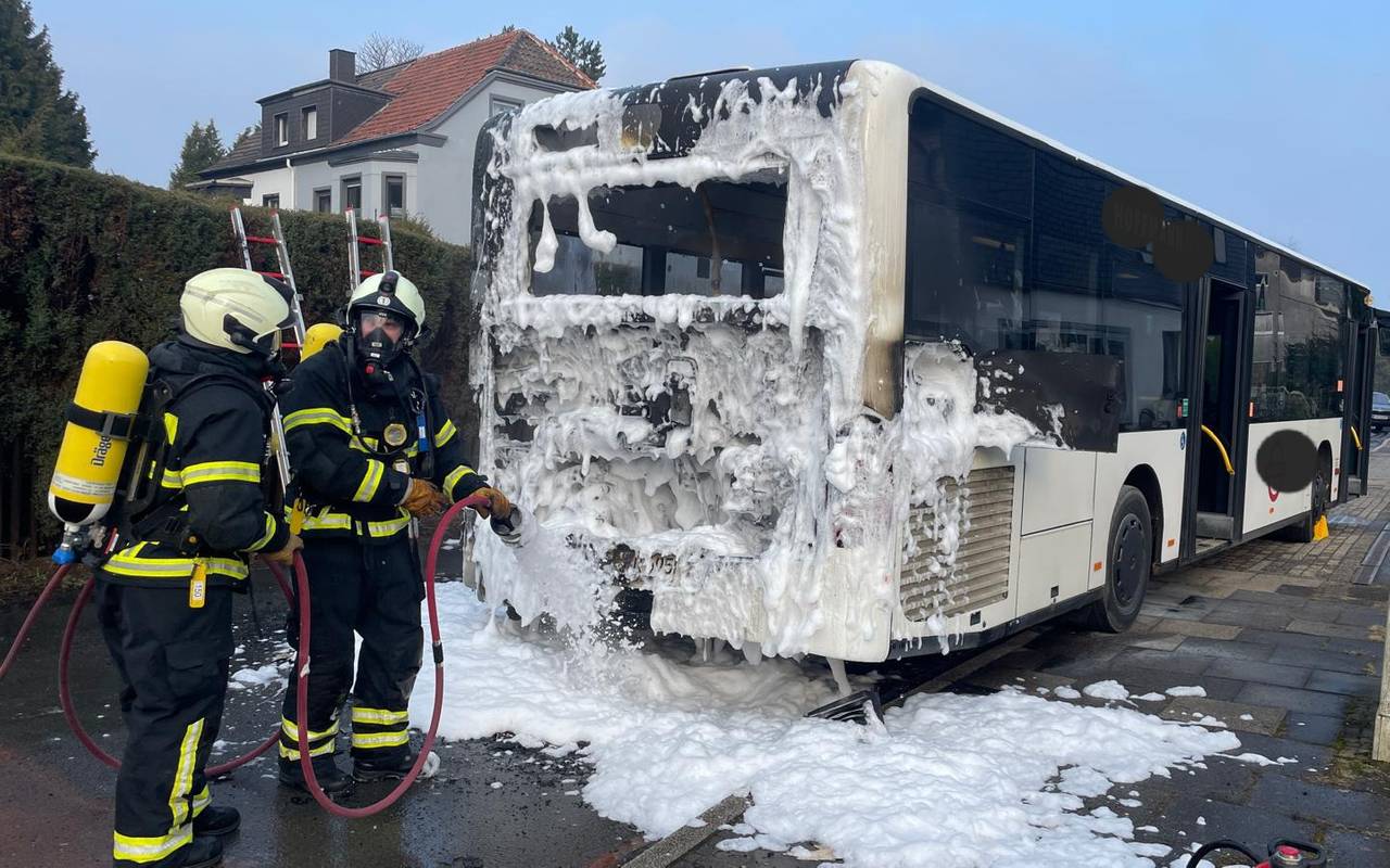 Die Feuerwehr Witten hat heute morgen einen brennenden Schulbus gelöscht. Glücklicherweise befanden sich keine Schüler an Bord und auch der Fahrer hatte den Bus bereits verlassen. Um kurz vor zehn (9:55 Uhr) heute morgen war die Feuerwehr in den Schneer Weg alarmiert worden. Dort stand der Bus mit einem brennenden Motorraum. Die Einsatzkräfte löschten die Flammen schnell und schäumten den Heckbereich des Busses zur Sicherheit ein. Die Ardeystraße wurde während des Einsatzes im betroffenen Bereich gesperrt.