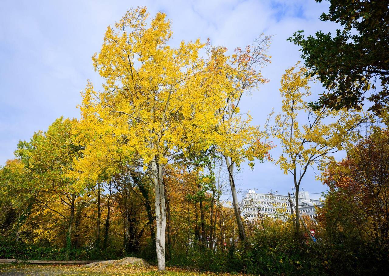 Zitterpappeln stehen an einem Parkplatz. Die Zitterpappel ist Baum des Jahres 2026.